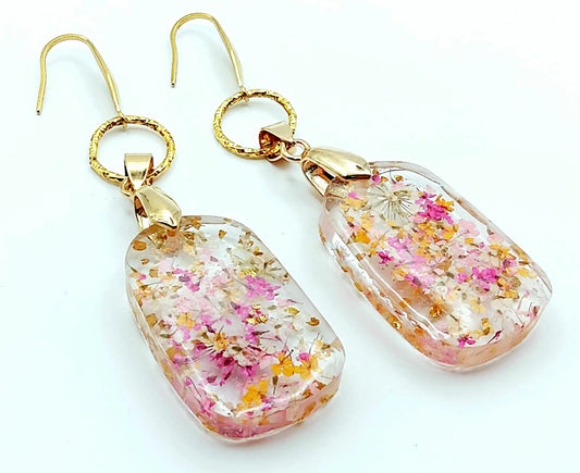 Boucles d'oreilles PENDANTES en résine. Fleurs roses, oranges et blanches