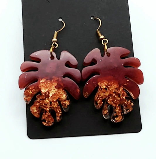 Boucles d'oreilles FEUILLES en résine époxy - Bordeaux et or