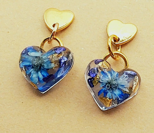 Boucles d'oreilles PETITS CŒURS FLEURIS en résine - Fleurs bleues