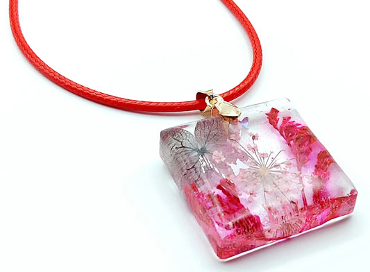 Pendentif CARRÉ en résine. Fleurs rouges