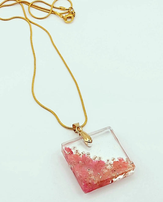 Pendentif CARRÉ en résine et sa chaîne - Fleurs roses
