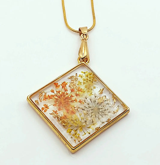 Pendentif CARRE en résine et sa chaîne - Fleurs séchées oranges et jaunes