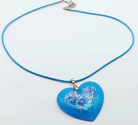 Pendentif "Coeur" en résine époxy, Bleu et paillettes coeurs et étoiles