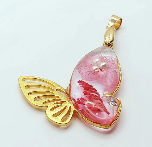 Pendentif PAPILLON ET FLEURS en résine époxy. Rose