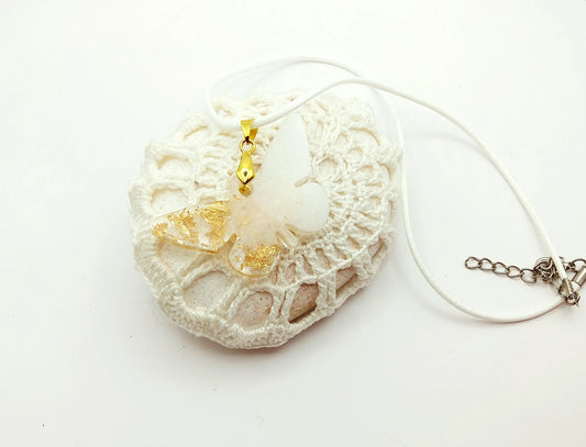 Pendentif PAPILLON en résine époxy. Blanc et or