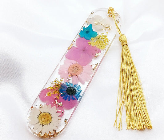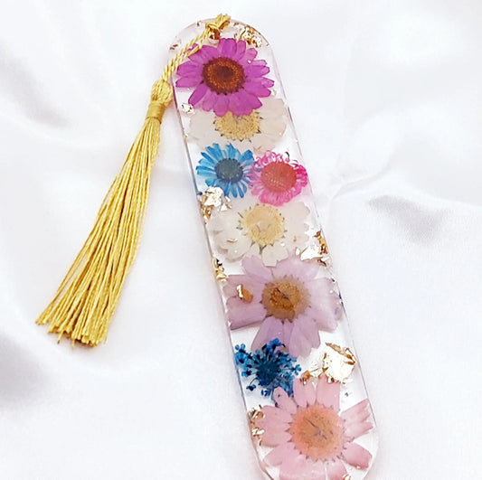 MARQUE-PAGES en résine époxy. Fleurs multicolores, feuille d'or