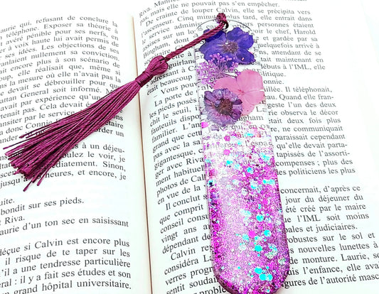 Marque-pages en résine époxy. Fleurs et paillettes violettes