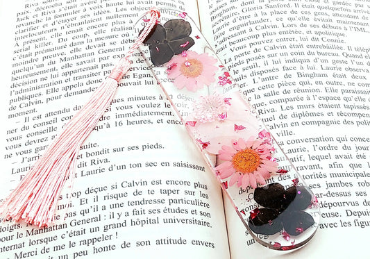 Marque-pages en résine. Fleurs séchées roses et noires