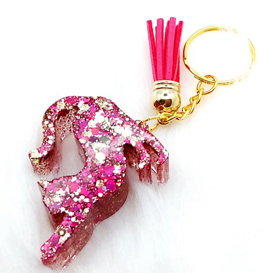 Porte-clés CHAT QUI S'ÉTIRE en résine. Paillettes Fuchsia et or