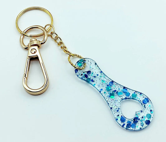 Porte-clés JETON DE CADDIE en résine. Transparent, paillettes bleues.