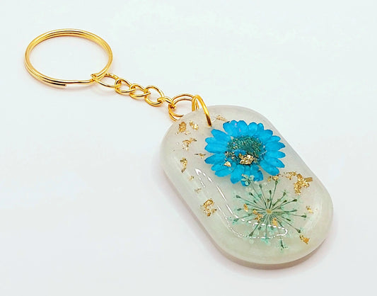 Porte-clés OVALE en résine époxy - Fleurs séchées bleues