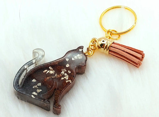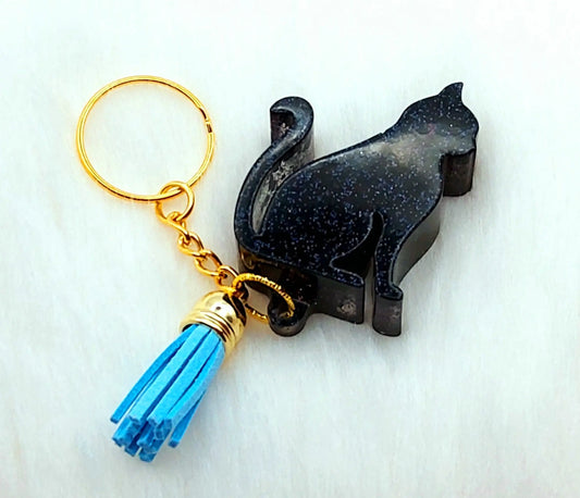 Porte-clés CHAT ASSIS en résine. Noir pailleté