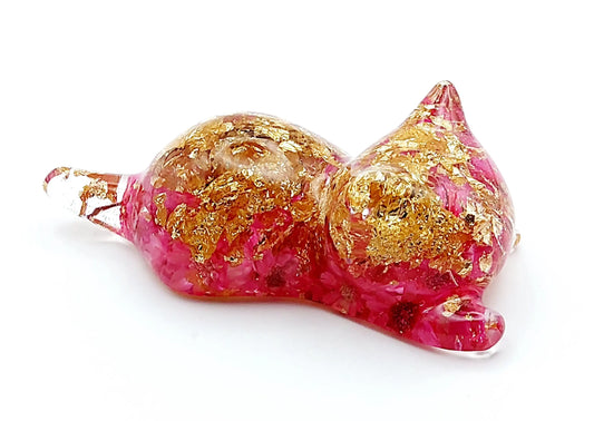 Figurine CHATON COUCHE en résine époxy - Fleurs roses et feuille d'or
